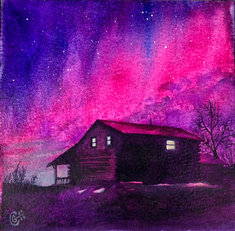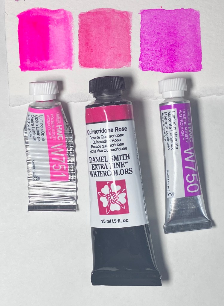 So what’s a hot-pink loving girl to do? I think the answer lies in using the very cleanest, most transparent, modern pigments available. Quinacridone Rose, Phthalo Blue, and Hansa Yellow Light are very bright, and pretty reliably light-fast (here’s a great value set of all three if you need to stock up). Clean (two color only) mixes and transparent washes over bright white (not natural) paper keep them brightest. Placing complimentary colors and dark and light valued colors next to each other also makes colors pop. In the photo below, you can see Quinacridone Rose (PV19) compared to two fluorescent paints of similar hues. It’s not as bright, but it’s close enough that when played up against Indanthrene Blue and Black in my painting of Northern lights it looks pretty luminous.