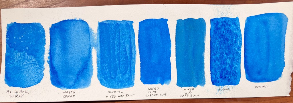 With that information, I decided to do some tests of my own, using Phthalo Blue; the least granulating pigment I can think of. My first test, with rubbing alcohol, had the best results. A quick spritz from a mister bottle on a damp wash made dramatic texture similar to using fine salt. A spritz with plain water did not make the same dramatic results. Mixing alcohol with the paint on my palette provided interesting texture also. Both of these looked similar to the results from commercial granulating mediums. Based on my research on granulating mixtures, I next tried making a granulating effect by mixing Phthalo Blue with granulating pigments – Cobalt Blue and Mars Black. Cobalt Blue had little effect, being too similar to the Phthalo Blue to show up. Mars Black added some visible texture but changed the hue dramatically. Finally, I tried sprinkling a damp wash with sugar, reasoning that sugar (in the form of honey or glucose) is an ingredient in watercolors anyway and the crystals might draw the pigment in the same way as salt. In fact, the sugar did create an effect very similar to salt, however small circles of dissolved sugar formed beneath each crystal which were shiny and dimensional. I suspect they might also be sticky in humid weather. I didn’t love the look, but I suppose it could be useful in some applications.